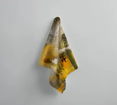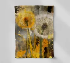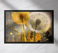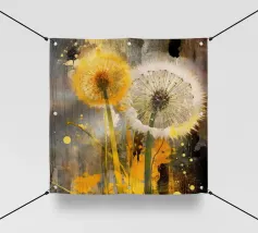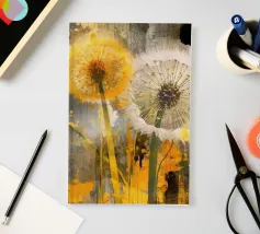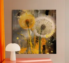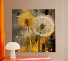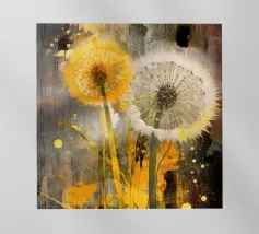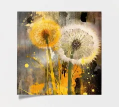Un collage astratto con un dente di leone, reimmaginato attraverso una sensibilità moderna e urbana. La forma delicata del dente di leone è frammentata, con strati scuri e strutturati di carta e metallo che contrastano con forme audaci e dinamiche. Sottili accenni d'oro brillano nella composizione, evidenziando la bellezza fugace del fiore. Elementi urbani come ritagli di giornale strappati, forme geometriche e texture ruvide si intrecciano con l'organico, evocando un senso di decadenza e rinnovamento. L'opera cattura la tensione tra fragilità e forza, tra natura e industria.