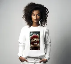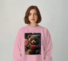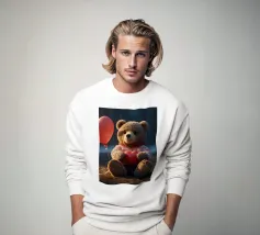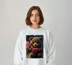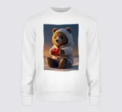 Un simpatico orsacchiotto vestito con un'accogliente felpa con cappuccio siede nella neve, tenendo gioiosamente un cuore rosso mentre un palloncino si muove nell'aria fresca della sera sotto un tramonto colorato.