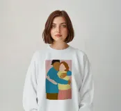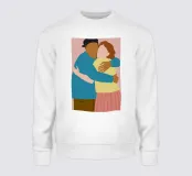 Un'illustrazione semplice e tenera di un uomo in camicia blu e una donna in gonna rosa che condividono un abbraccio stretto e caloroso su uno sfondo scuro.