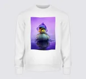 Un piccolo anatroccolo nuota giocosamente nell'acqua calma, indossando un vivace cappello viola. Lo sfondo è morbido e sognante, creando un'atmosfera stravagante intorno all'allegra scena.