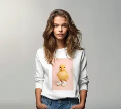 Un piccolo anatroccolo nuota giocosamente nell'acqua calma, indossando un vivace cappello viola. Lo sfondo è morbido e sognante, creando un'atmosfera stravagante intorno all'allegra scena.