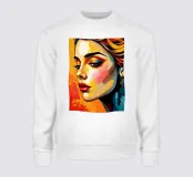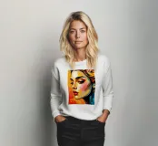 Un ritratto di grande impatto presenta una donna con un'acconciatura vivace e un trucco audace, che mette in mostra i suoi eleganti orecchini.