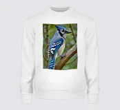 La ghiandaia azzurra siede con grazia su un ramo robusto, con le sue piume bianche e blu che contrastano con lo sfondo del fogliame verde nella luce del mattino.