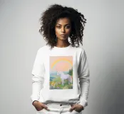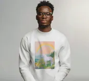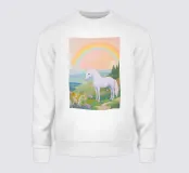 Un dolce unicorno in piedi davanti a dolci colline e a un luminoso cielo arcobaleno: questo disegno cattura il fascino della fantasia e la meraviglia dell'infanzia. Perfetto per le camerette, le stanze dei giochi o per chiunque ami la tranquilla magia dei paesaggi mitici.