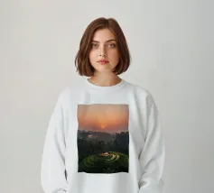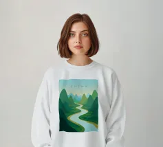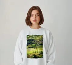 La valle è ricoperta da campi di riso di un verde intenso, che si estendono a perdita d'occhio. Le terrazze seguono le dolci curve delle colline, creando un modello armonioso di vita e crescita. Uno stretto fiume si snoda tra i campi, riflettendo il cielo blu sopra di essi. I contadini si muovono tranquillamente lungo i sentieri, curando i loro raccolti, mentre la brezza porta il fresco profumo della terra bagnata e del riso giovane. L'intera scena sembra pacifica, fertile e piena di vitalità.