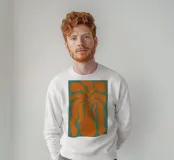 Un vaso stilizzato dalle forme astratte e fluide si estende verso l'esterno, ricordando forme vegetali. Il colore arancione vibrante contrasta con lo sfondo verde tenue, creando un effetto visivo dinamico.