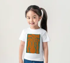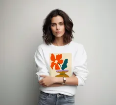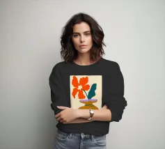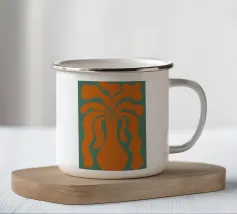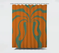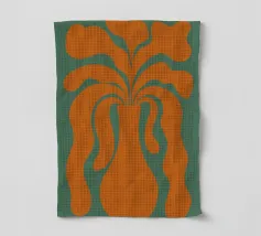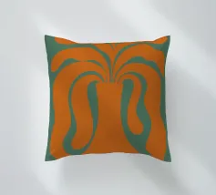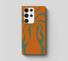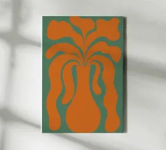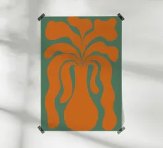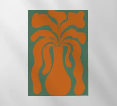 Un vaso stilizzato dalle forme astratte e fluide si estende verso l'esterno, ricordando forme vegetali. Il colore arancione vibrante contrasta con lo sfondo verde tenue, creando un effetto visivo dinamico.