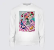 Un'affascinante natura morta di un tavolo da colazione con un vaso di fiori rosa, una ciotola di gelato e una banana. Il vaso a righe e l'ambientazione colorata creano una scena dolce, allegra e leggermente stravagante.