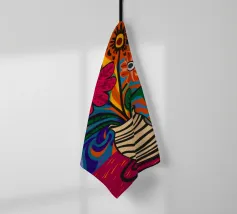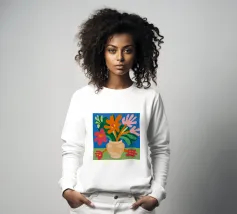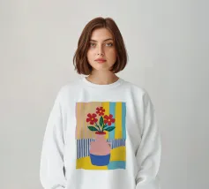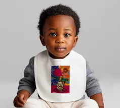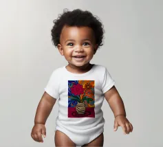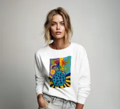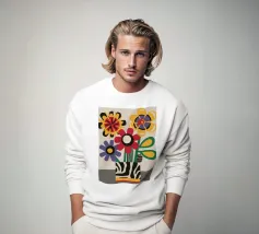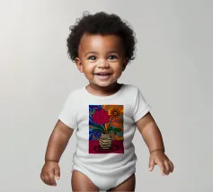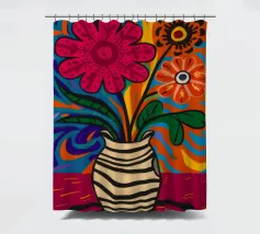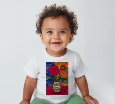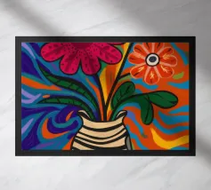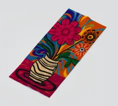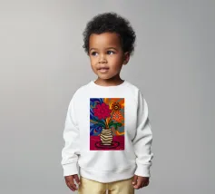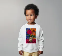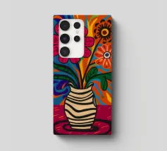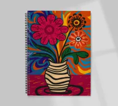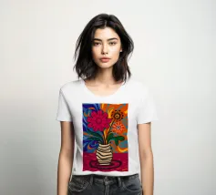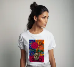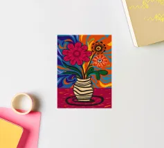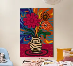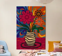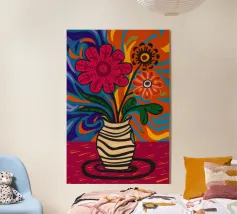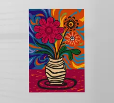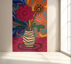 Una vibrante natura morta pop art di un bouquet di fiori colorati e stilizzati in un vaso a righe bianche e nere. La composizione è un'energica, gioiosa e moderna esplosione di colori e motivi.