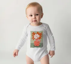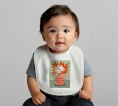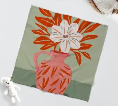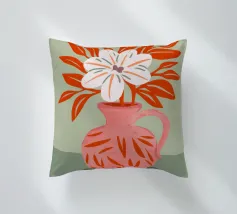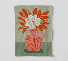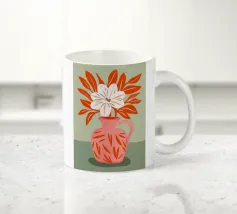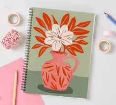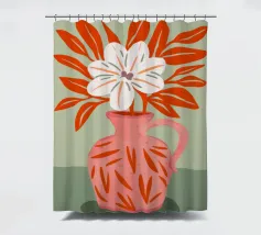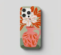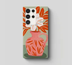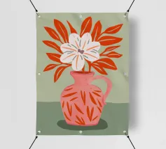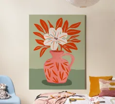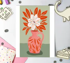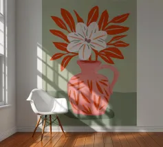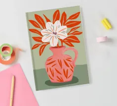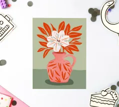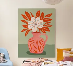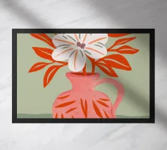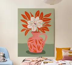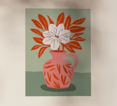 Un'illustrazione elegante e minimalista di un semplice vaso che contiene un bouquet di papaveri rossi e arancioni, che mette in risalto la semplice bellezza dei fiori.