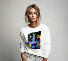 Una prospettiva aerea cattura una magnifica fontana circondata da acqua scintillante, che riflette colori vivaci mentre il sole tramonta sul parco sereno.