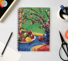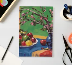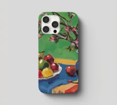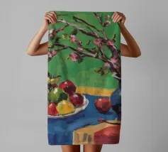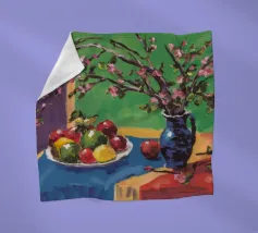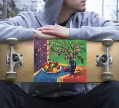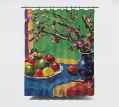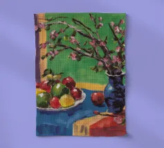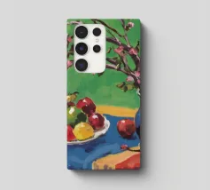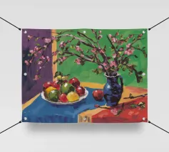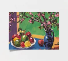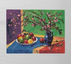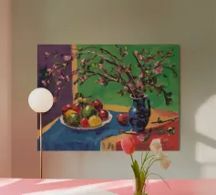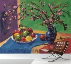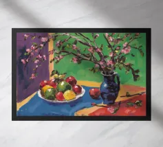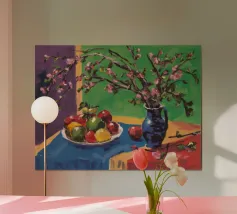 Una natura morta con rami con fiori rosa e foglie verdi in un vaso scuro, accanto a mele e arance su una superficie blu su sfondo rosso.
