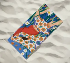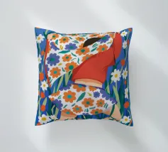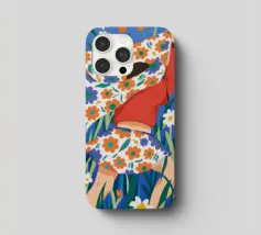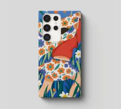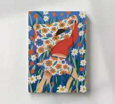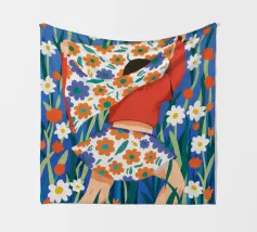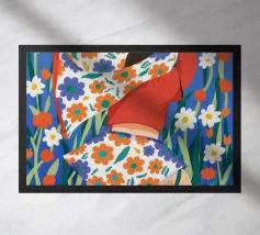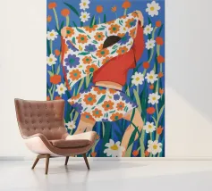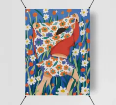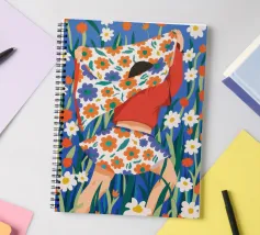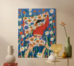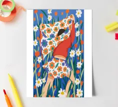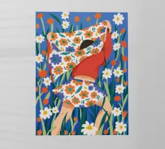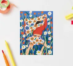 Un'affascinante illustrazione di una volpe rossa in piedi in un campo di fiori selvatici densi e colorati. Lo stile è giocoso e ha una qualità da arte popolare.