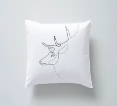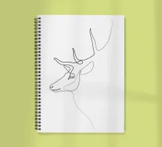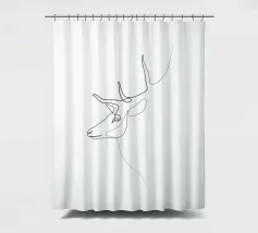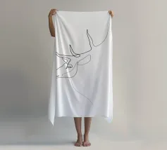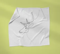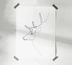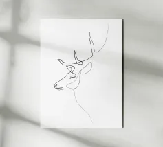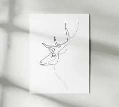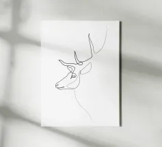 Illustrazione minimalista di un cervo, catturato in una forma fluida e astratta. Questa graziosa composizione evoca forza e serenità e si adatta perfettamente a interni tranquilli e contemporanei. Un tranquillo omaggio alla natura e all'eleganza.