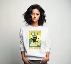 Un biglietto illustrato umoristico per il bagno degli ospiti: "Siediti, non fare pipì in piedi!". - in colori pastello e design minimalista, perfetto per un bagno moderno.