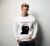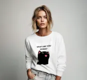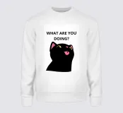 Un gatto nero con occhi gialli e orecchie rosa guarda in alto con un'espressione curiosa. Sopra il gatto "COSA STAI FACENDO?".