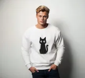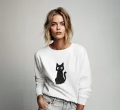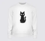 Un piccolo gattino nero siede in posizione eretta con una postura vigile e curiosa, i suoi occhi bianchi sovradimensionati gli conferiscono un'espressione luminosa e accattivante. La pelliccia è resa con texture morbide e color inchiostro e sottili dettagli splatter, creando un fascino dipinto a mano e leggermente disordinato. La coda si arriccia delicatamente di lato e lo sfondo bianco e pulito fa risaltare la silhouette scura e i tratti espressivi con una chiarezza semplice e stravagante.
