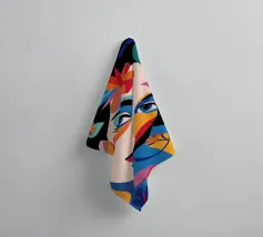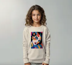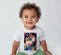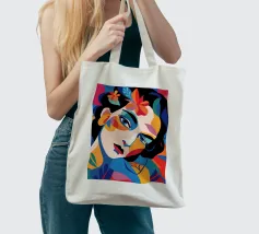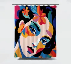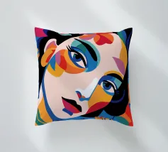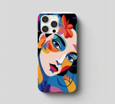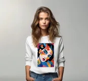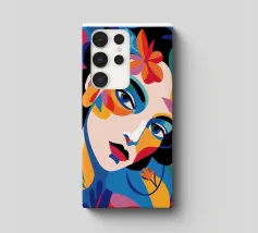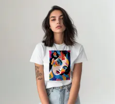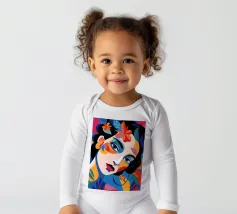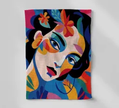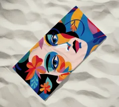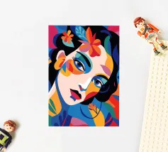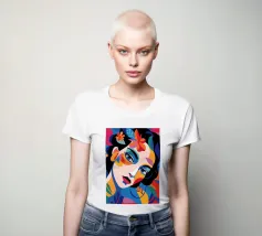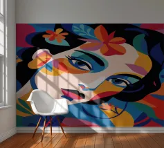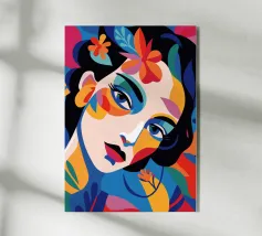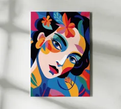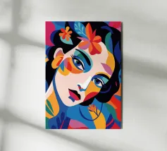 Una composizione vibrante mostra il volto di una donna adornato da elementi colorati come fiori e forme astratte. L'uso di colori audaci e contrastanti crea un senso di dinamismo e modernità.