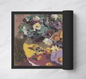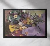 Una natura morta incentrata su una ciotola di limoni e altri frutti, forse mele o pere, su un tavolo con un drappo bianco. Lo sfondo è scuro e indistinto.