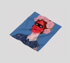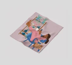 Questa opera d'arte raffigura una persona con un vivace top giallo a fiori e pantaloni blu, che assume una posa dinamica su uno sfondo rosa con motivi floreali arancioni.