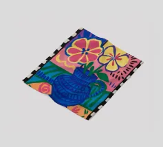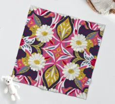 Un vivace patchwork di motivi e fantasie diverse, che combina elementi floreali, forme astratte e disegni di piastrelle. L'eclettico mix di colori e stili crea una composizione visivamente ricca e gioiosa, che ricorda una parete di piastrelle del Mediterraneo.