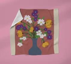 Un vaso dalla splendida fantasia racchiude un vivace bouquet di fiori, con una farfalla che si posa graziosamente in cima. La composizione presenta varie fioriture, tra cui le viole del pensiero, su uno sfondo scuro che ne mette in risalto i colori vivaci.