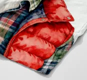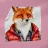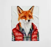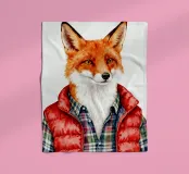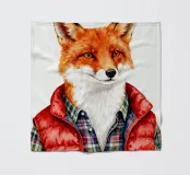 Ritratto realistico ad acquerello di una maestosa volpe rossa vestita con un gilet rosso e una flanella a quadri blu-verde.