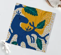 Un'opera d'arte astratta composta da vari patch strutturati, tra cui stampe di animali e colori solidi come l'arancione e il blu, che creano un patchwork moderno visivamente interessante e armonioso.