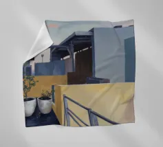 La geometria spoglia di una passerella coperta è definita da audaci pilastri cremisi e dalle ombre lunghe e nette che proiettano nella luce del sole. Questo dipinto è un potente studio di luce, ombra, colore e forma architettonica.