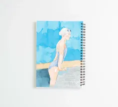 Immersa in una luce liquida, una nuotatrice solitaria indugia sul bordo della piscina, la cui silhouette è ammorbidita dal delicato lavaggio dell'acquerello. Forza e serenità si intrecciano mentre lei guarda nel blu, un momento di quiete sospeso tra movimento e memoria, dipinto con respiro e grazia.