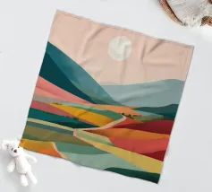 An expressive and vibrant landscape painting of rolling, patchworklike fields in shades of green, yellow, and pink. The painterly style captures the dynamic beauty and texture of the countryside.