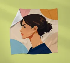 Questo elegantissimo ritratto di profilo mostra una donna con ricchi capelli rosso rubino meticolosamente acconciati in uno chignon. Il suo sguardo riflessivo e sereno, abbinato a un semplice orecchino d'oro su un morbido sfondo verde, crea un'aura senza tempo di classica bellezza e raffinatezza.
