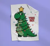 A cheerful green dinosaur is humorously decorated to resemble a Christmas tree, complete with colorful lights and a star on its head. The words "Tree Rex" are playfully written beside it, adding to the festive theme.