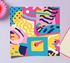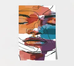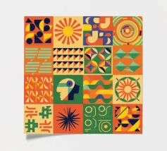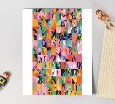 Una composizione astratta vibrante ed energica con un volto stilizzato integrato in un patchwork colorato di motivi geometrici. L'opera è un'esplorazione moderna e giocosa dell'identità e della forma.