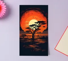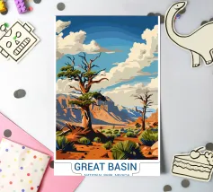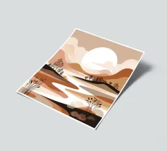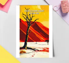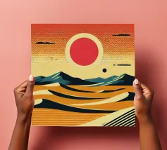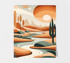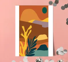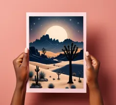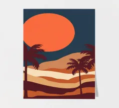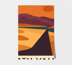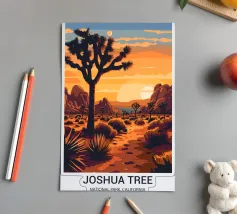Tramonti infuocati, rocce rosse e le indimenticabili sagome degli alberi di Joshua. Questo poster riassume l'essenza cruda e mistica del deserto californiano. Uno stile forte, sia grafico che contemplativo