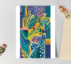Un vivace e gioioso patchwork di vari motivi astratti e colori, tra cui fiori, strisce e forme geometriche, che creano un design tessile vivace ed energico.