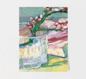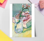 Ramo di mandorlo fiorito in un bicchiere con un libro