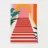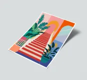 Scale rosse e vivaci conducono attraverso un edificio colorato e semplificato verso un lussureggiante ingresso ad arco, suggerendo un viaggio verso una destinazione bella ed esotica.