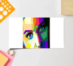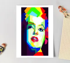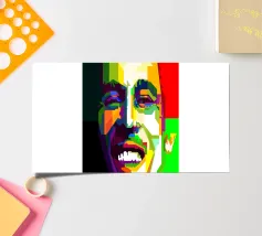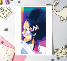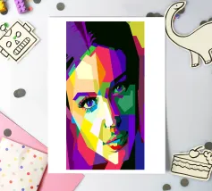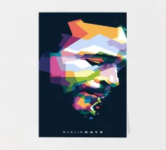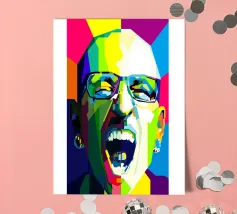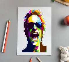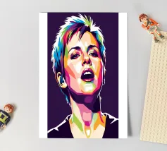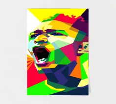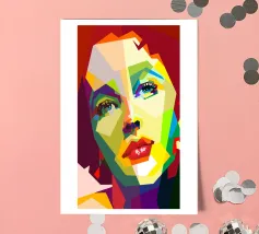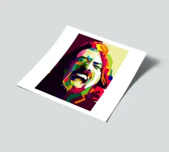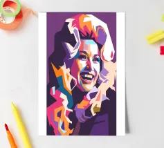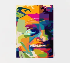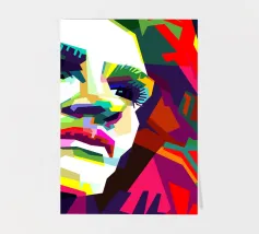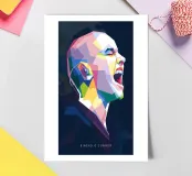 Un ritratto vibrante e geometrico di Sinead O'Connor in stile WPAP, caratterizzato da forme audaci e angolari e da un'impressionante gamma di colori vivaci e contrastanti. L'opera cattura i suoi tratti iconici, come la testa rasata, gli occhi penetranti e la forte espressione facciale, utilizzando blocchi di colore nitidi e frammentati. La composizione enfatizza la profondità e l'emozione mantenendo l'estetica pop-art cubista distintiva di WPAP, creando un tributo visivamente dinamico e moderno alla leggendaria cantante.