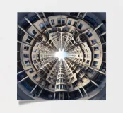 Una vista fisheye di un edificio cilindrico che mostra balconi curvi, architettura simmetrica e torri verticali che convergono verso un luminoso cielo centrale. L'intricato design enfatizza la moderna innovazione urbana e l'armonia strutturale.