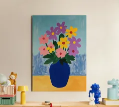 Una vivace serie di fiori di campo colorati disposti in un vaso blu. Lo sfondo è di un rosa strutturato e modellato, creando una composizione ricca e gioiosa, piena di vita e di colore.