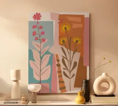 Una composizione moderna e astratta caratterizzata da un patchwork di vari motivi e forme. Gli elementi includono forme organiche simili a foglie, griglie geometriche e texture astratte in una tavolozza tenue di rosa, nero e beige, che riflette uno stile bohémien ed eclettico.