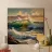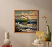 This oil painting captures the power and beauty of offshore waves. Towering swells rise and surge, rendered in bold strokes of deep blue, sea green, and foamy white, creating striking contrasts. Sunlight reflects off the ocean’s surface, shimmering and ever-shifting. The painting evokes a sense of freedom, the majesty of nature, and the boundless energy of the sea.