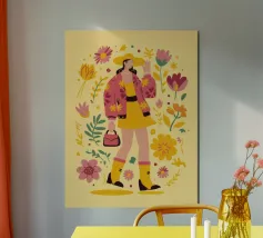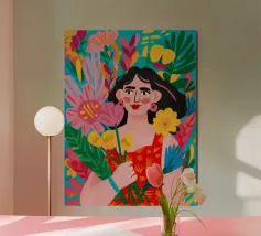 Questa opera d'arte raffigura una persona con un vivace top giallo a fiori e pantaloni blu, che assume una posa dinamica su uno sfondo rosa con motivi floreali arancioni.