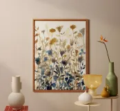 This atmospheric watercolor captures wildflowers silhouetted against soft, golden light. Loose brushstrokes and a palette of indigo, ochre, and taupe create a delicate balance between detail and abstraction.