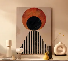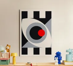 A geometric composition features a large circle intersected by vertical lines, topped with a bold red circle. The monochrome elements contrast against a dark, swirling background.