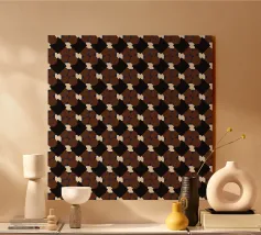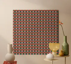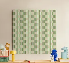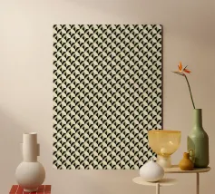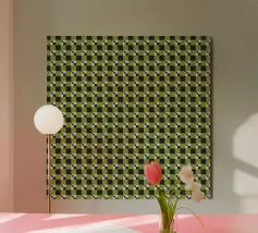 L'immagine presenta un motivo geometrico complesso e ripetuto con forme interconnesse. Una miscela di verde, nero e bianco domina la composizione, creando un effetto visivamente dinamico.