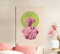 Una reinterpretazione contemporanea della bellezza antica. Quest'opera d'arte presenta la silhouette di una statua greca sovrapposta a una geometria minimalista e colorata, che dà nuova vita all'antichità classica. Perfetto per gli amanti della storia, dell'arte e degli interni raffinati.