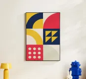 Un dinamico poster astratto costruito su un sistema modulare a griglia, che mostra un'audace interazione di forme geometriche e forti colori di ispirazione primaria: blu marino intenso, giallo brillante e rosso vibrante. La composizione presenta quadranti con grandi semicerchi, un quadrato centrale con un nitido motivo triangolare giallo e un blocco rosso con una griglia di nove cerchi chiari. Questo disegno cattura perfettamente lo spirito dell'estetica Bauhaus e Mid-Century Modern grazie alla sua enfasi sulla struttura, sulla funzionalità e sulle forme semplificate. Questo download digitale ad alta risoluzione (7000x5000 pixel, 300 dpi) fornisce una
