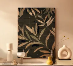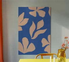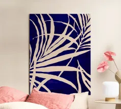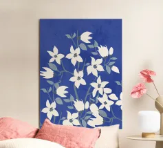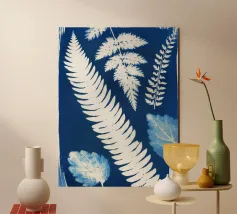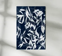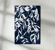 A striking cyanotype-style composition capturing delicate white leaves drifting across a deep indigo field. This piece evokes early botanical photography with a contemporary edge—organic yet graphic, timeless yet modern. Perfect for interiors that lean toward minimalist naturalism or vintage scientific aesthetics.